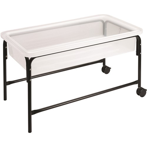 This strong and versatile plastic tray features a water release plug in the bottom for easy release. Includes a strong tubular frame fitted with two lockable casters for easy movement. The steel frame is designed to hold the Sand and Water Play tray. Translucent, 580mm high, the tray measures 1100x605x215mm. The set includes 1 tray with 580mm high stand.