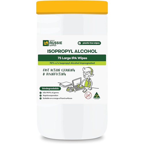 Great Aussie ISOPROPYL ALCOHOL wipes are impregnated with 70% isopropyl alcohol, designed for high quality cleaning and disinfection against 99.9% of germs and bacteria. Rapid evaporation properties, ideal for cleaning surfaces that are water sensitive including electronics, screens, phones, computers, general metal, and hard plastics. Will not scratch glazed, metal, or polished surfaces. Made from super tough plant-based fibres. Used wipes can be placed into green bins or general waste. Key Features Kills 99.9% of germs/bacteriaRapid evaporationSuitable on a range of hard surfaces