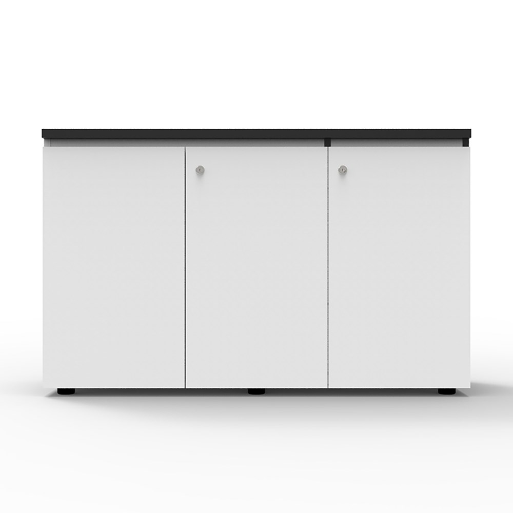 Deluxe Infinity Swing 3 Door Cupboard 1200mm W x 450mm D x 730mm H Shark Nose Feature On Top Door Front For Easy Opening Lockable, Supplied With 2 x Keys Finished In Laminate With Black Rigid Edging Adjustable Levelling Feet