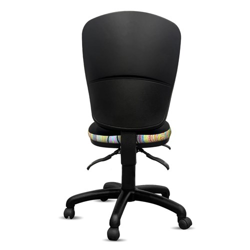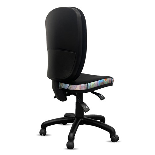 A unique commercial fabrics designed by Liddy Napanangka Walker (Indigenous Artist) combined with K2 Black Fabric to upholster the chair. Weight rating: AFRDI Rated Load 160kg Approved. Indicated seat hours: 24/7. Seat Dimensions: 510W x 490D x 460-590mmH. Back Height: 560mmW. Back Width: 480mm. Heavy duty commercial chair with 3 lever mechanism and ratchet back height adjustment. 5 way 700mm commercial grade nylon base. Heavy duty gas lift cylinder. Moulded seat foam for supreme comfort. Fire retardant contoured moulded foam. Product image for reference only. Design pattern may differ as a result of variations in the art work. 10 Year Years Manufacturer's Warranty. Delivery, installation and assembly charges may apply to furniture. Please enquire to confirm. Optional adjustable armrest available. Refer to product code 3043352.