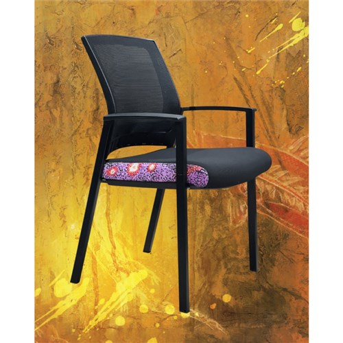 A unique commercial fabrics designed by Andrea Adamson (Indigenous Artist) combined with K2 Black Fabric to upholster the chair. Weight rating: 135kg. Indicated seat hours: 12 hours. Seat Dimensions: 505W x 450D x 490mmH. Back Height: 460mm. Back Width: 440mm. Heavy duty commercial chair with 3 lever mechanism and ratchet back height adjustment. Excellent posture correct lumbar. Solid, flat PU arms. Sleek design for comfort. Chairs stack 4 high. Product image for reference only. Design pattern may differ as a result of variations in the art work. 7 Year Years Manufacturer's Warranty. Delivery, installation and assembly charges may apply to furniture. Please enquire to confirm.