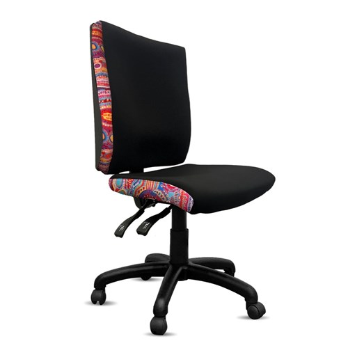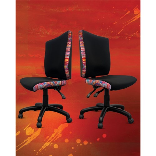 A unique commercial fabrics designed by Murdie Nampijinpa Morris (Indigenous Artist) combined with K2 Black Fabric to upholster the chair. Weight rating: 135kg. Indicated seat hours: 24/7. Seat Dimensions: 510W x 450D x 460-590mmH. Back Height: 580mmW. Back Width: 495mm. Heavy duty commercial chair with 3 lever mechanism and ratchet back height adjustment. 5 way 700mm commercial grade nylon base. Heavy duty gas lift cylinder. Moulded seat foam for supreme comfort. Fire retardant contoured moulded foam. Product image for reference only. Design pattern may differ as a result of variations in the art work. 7 Year Years Manufacturer's Warranty. Delivery, installation and assembly charges may apply to furniture. Please enquire to confirm. Optional adjustable armrest available. Refer to product code 3043352.