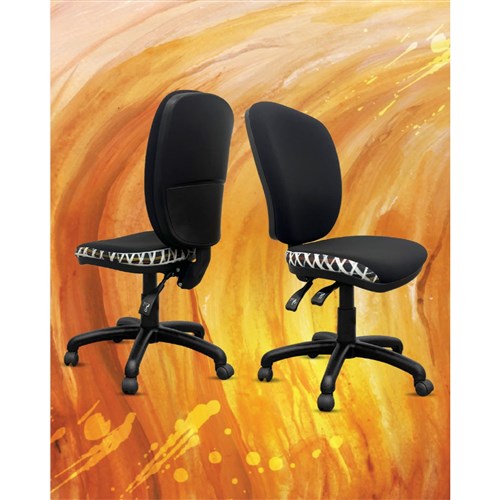 A unique commercial fabrics designed by Paulina Puruntatameri (Indigenous Artist) combined with K2 Black Fabric to upholster the chair. Weight rating: 135kg. Indicated seat hours: 24/7. Seat Dimensions: 510W x 450D x 460-590mmH. Back Height: 500mmW. Back Width:495mm. Heavy duty commercial chair with 3 lever mechanism and ratchet back height adjustment. 5 way 700mm commercial grade nylon base. Heavy duty gas lift cylinder. Moulded seat foam for supreme comfort. Fire retardant contoured moulded foam. Product image for reference only. Design pattern may differ as a result of variations in the art work. 7 Year Years Manufacturer's Warranty. Delivery, installation and assembly charges may apply to furniture. Please enquire to confirm. Optional adjustable armrest available. Refer to product code 3043352.