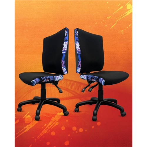 A unique commercial fabrics designed by Murdie Nampijinpa Morris (Indigenous Artist) combined with K2 Black Fabric to upholster the chair. Weight rating: 135kg. Indicated seat hours: 24/7. Seat Dimensions: 510W x 450D x 460-590mmH. Back Height: 500mmW. Back Width:495mm. Heavy duty commercial chair with 3 lever mechanism and ratchet back height adjustment. 5 way 700mm commercial grade nylon base. Heavy duty gas lift cylinder. Moulded seat foam for supreme comfort. Fire retardant contoured moulded foam. Product image for reference only. Design pattern may differ as a result of variations in the art work. 7 Year Years Manufacturer's Warranty. Delivery, installation and assembly charges may apply to furniture. Please enquire to confirm. Optional adjustable armrest available. Refer to product code 3043352.