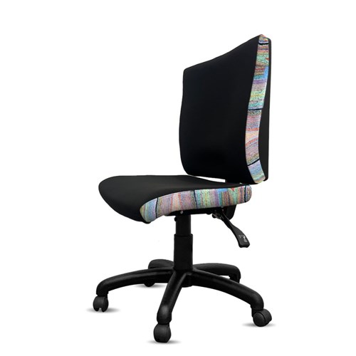 A unique commercial fabrics designed by Liddy Napanangka Walker (Indigenous Artist) combined with K2 Black Fabric to upholster the chair. Weight rating: 135kg. Indicated seat hours: 24/7. Seat Dimensions: 510W x 450D x 460-590mmH. Back Height: 500mmW. Back Width:495mm. Heavy duty commercial chair with 3 lever mechanism and ratchet back height adjustment. 5 way 700mm commercial grade nylon base. Heavy duty gas lift cylinder. Moulded seat foam for supreme comfort. Fire retardant contoured moulded foam. Product image for reference only. Design pattern may differ as a result of variations in the art work. 7 Year Years Manufacturer's Warranty. Delivery, installation and assembly charges may apply to furniture. Please enquire to confirm. Optional adjustable armrest available. Refer to product code 3043352.