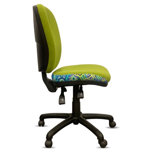 A unique commercial fabrics designed by Cedric Varcoe (Indigenous artist) combined with K2 Eucalyptus Green Fabric to upholster the chair. Weight rating: AFRDI Rated Load 160kg Approved. Indicated seat hours: 24/7. Seat Dimensions: 510W x 490D x 460-590mmH. Back Height: 560mmW. Back Width: 480mm. Heavy duty commercial chair with 3 lever mechanism and ratchet back height adjustment. 5 way 700mm commercial grade nylon base. Heavy duty gas lift cylinder. Moulded seat foam for supreme comfort. Fire retardant contoured moulded foam. Product image for reference only. Design pattern may differ as a result of variations in the art work. 10 Year Years Manufacturer's Warranty. Delivery, installation and assembly charges may apply to furniture. Please enquire to confirm. Optional adjustable armrest available. Refer to product code 3043352.