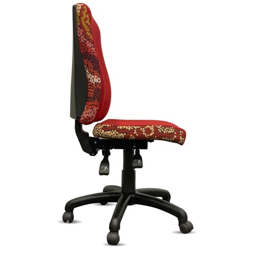 A unique commercial fabrics designed by Damien and Yilpi Marks (Indigenous artists) combined with K2 Red Ochre Fabric to upholster the chair. Weight rating: 135kg. Indicated seat hours: 24/7. Seat Dimensions: 510W x 450D x 460-590mmH. Back Height: 580mmW. Back Width: 495mm. Heavy duty commercial chair with 3 lever mechanism and ratchet back height adjustment. 5 way 700mm commercial grade nylon base. Heavy duty gas lift cylinder. Moulded seat foam for supreme comfort. Fire retardant contoured moulded foam. Product image for reference only. Design pattern may differ as a result of variations in the art work. 10 Year Years Manufacturer's Warranty. Delivery, installation and assembly charges may apply to furniture. Please enquire to confirm. Optional adjustable armrest available. Refer to product code 3043352.