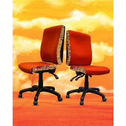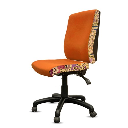 A unique commercial fabrics designed by Paddy Stewart (Indigenous artist) combined with K2 Golden Orange Fabric to upholster the chair. Weight rating: 135kg. Indicated seat hours: 24/7. Seat Dimensions: 510W x 450D x 460-590mmH. Back Height: 500mmW. Back Width:495mm. Heavy duty commercial chair with 3 lever mechanism and ratchet back height adjustment. 5 way 700mm commercial grade nylon base. Heavy duty gas lift cylinder. Moulded seat foam for supreme comfort. Fire retardant contoured moulded foam. Product image for reference only. Design pattern may differ as a result of variations in the art work. 10 Year Years Manufacturer's Warranty. Delivery, installation and assembly charges may apply to furniture. Please enquire to confirm. Optional adjustable armrest available. Refer to product code 3043352.