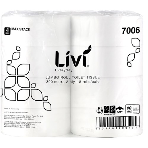 Livi Basics jumbo 2ply toilet paper fits a standard toilet roll for convenience and gives you the strength and quality of 2ply toilet paper, along with softness and value. With a continuous roll and toilet paper made from virgin pulp, you are sure to get an excellent product The toilet roll length is 300m, and there are eight units to a carton.
