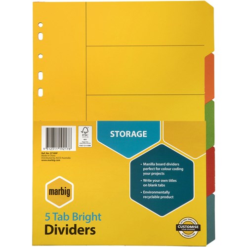 Marbig A4 5 Tab Bright Multi-Coloured Dividers