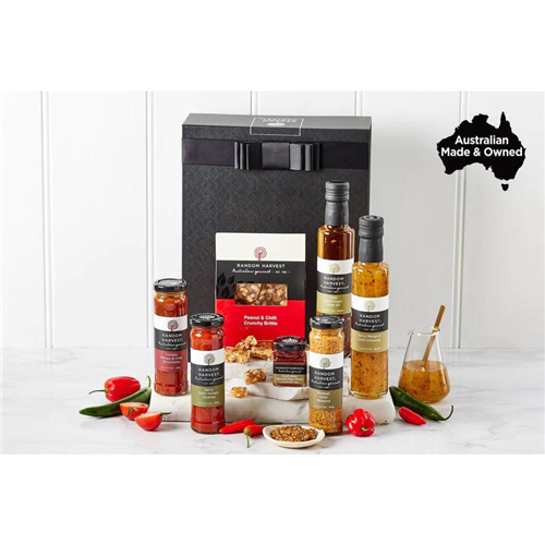 Some like it hot, and those that do will be delighted with our artisan selection of gourmet chilli treats. With a little spice for everyone from chilli sweets, to premium chilli condiments, this is the best of Australian made chilli infused foods. Beautifully presented in our luxury gift box, the Chilli Lovers Artisan Hamper features all our spicy favourites including our best-selling Fireball Chilli Mustard that's the perfect partner for burgers, roasts or adding a zing to your next potato dish. Our Chilli infused extra virgin olive oil features 100% Australian olive oil from the NSW Hunter Valley region, infused with just the right balance of chilli to bring amazing flavour to your cooking without being too overpowering. The Chilli Lovers Artisan Hamper Includes: Chilli Brittle 125gSpicy Chilli Tomato Chutney 160gFireball Chilli Mustard 150gTomato Mango & Chilli Bruschetta 150gSpiced Pear Paste 60gChilli Infused Oil 250mlSpicy Chilli & Mango Dressing 250mlHamper Box
