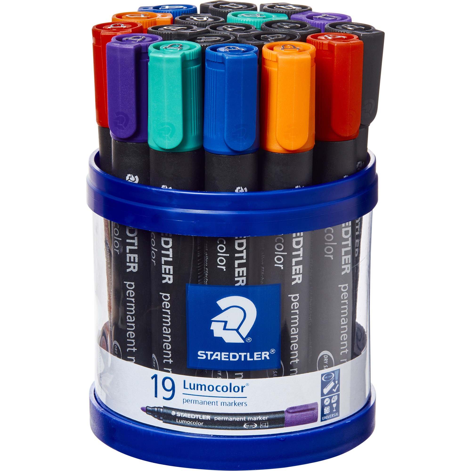 • Cup of 19 markers in black or assorted: 2x red, 2x blue, 2x green, 2x orange, 2x violet & 9x black.