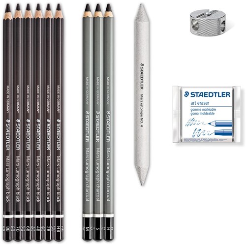 Pack includes the following: Mars Lumograph charcoal 100C & Mars Lumograph black 100B to get very expressive results with just a few pencil strokes Blender pencil 5426 for shading the artwork in any black and grey tones Art eraser 5427 Art sharpener 510 25 Graphite pencils made of certified wood from sustainably managed forests Hangable cardboard box with window for visibility of products Step-by-step-instructions and detailed descriptions of the applications
