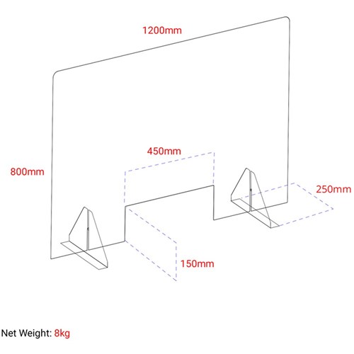An ideal solution for infection control Lightweight And Removable Fast And Easy To Install, Complete With X2 Mounting Stand With Premium Adhesive Tape Pre-Fitted. Supplied In Flat Pack Suitable For Retail Counters, Medical Centres, Pharmacies, Reception Desks, Offices And More Full Dimension: 1200 mm (W) x 800 mm (H) Mounting Stand: 250mm length Transaction Slot: 300 x 150 mm