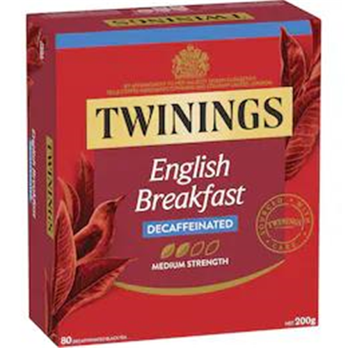 Twinings English Breakfast Decaffeinated is medium strength. Estd. 1706 London At Twinings, our master blenders have been blending quality teas for over 300 years. Each blend is created with the finest ingredients to deliver a superior excellence in every cup.